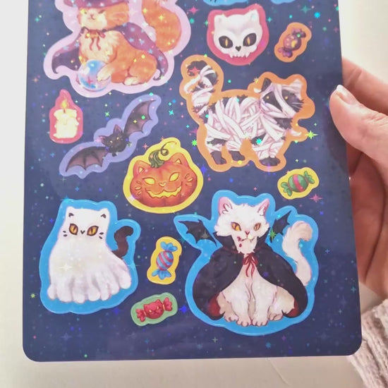 Die Spooky Season ist endlich da und deshalb gibt es hier ein passendes süßes Katzen Stickersheet mit 14 kleinen und großen Stickern :3