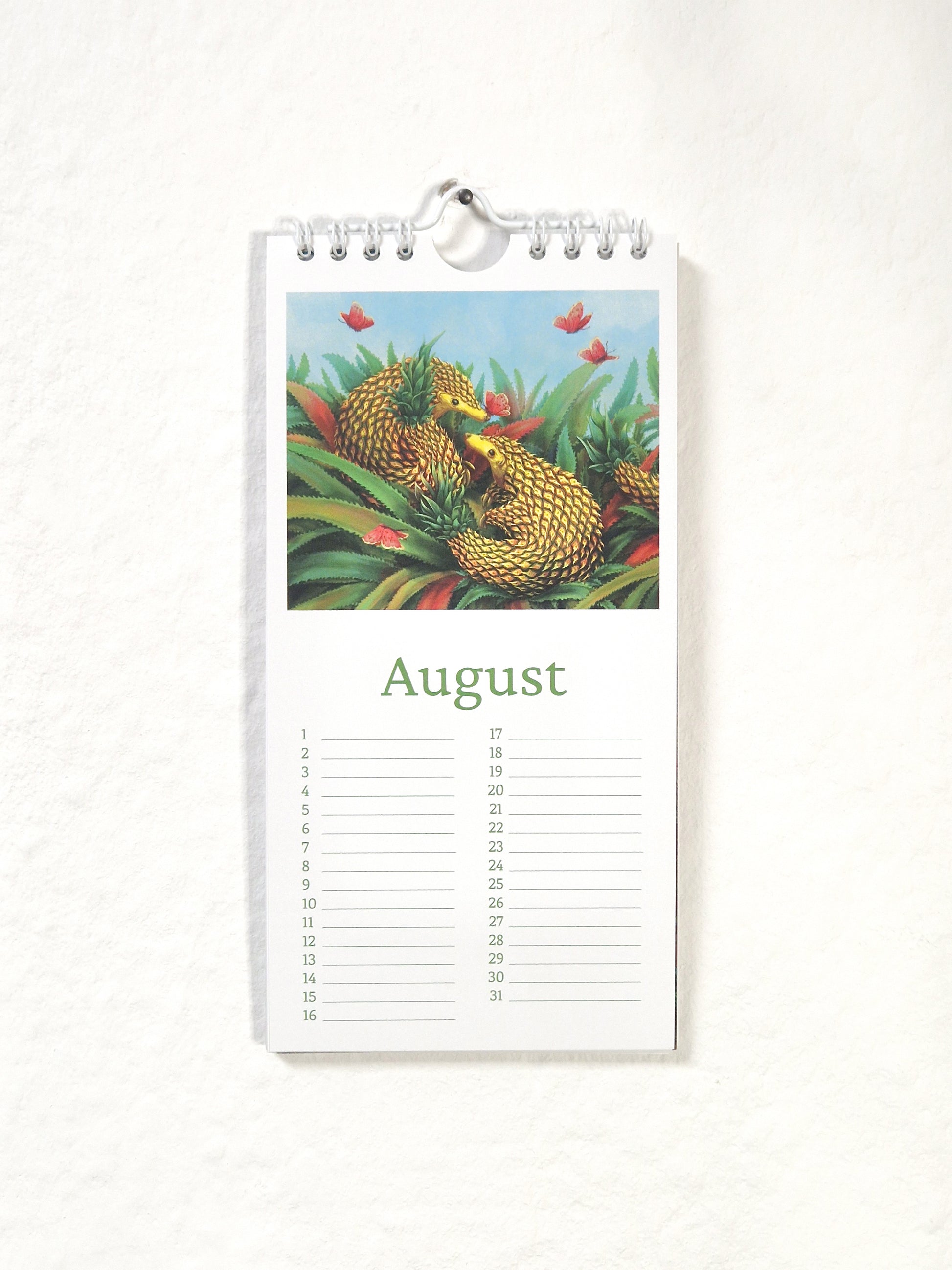 Der Kalender hat eine weiße Ringbindung und ist im Format 105mm x 210mm.